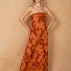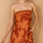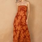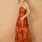 Effortlessly chic, this strapless jumpsuit makes a bold statement with its warm rust hue and all-over floral print. Designed with a smocked bodice for a comfortable fit and wide-leg silhouette for easy movement, it’s the perfect blend of relaxed and elegant. Dress it up with wedges or keep it casual with sandals for versatile day-to-night style.
