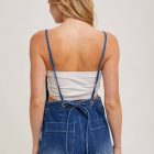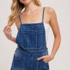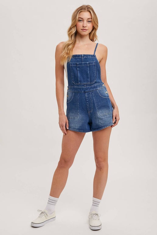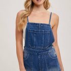 The denim overall shorts feature a playful and casual design with a bow-tie detail. The shorts are crafted from classic denim fabric, offering a laid-back and versatile style. With the convenience of pockets, these overall shorts provide both functionality and fashion. The back tie adds a unique touch, creating a flattering silhouette and allowing for an adjustable fit. Perfect for warm and sunny days, these denim overall shorts offer a chic and comfortable option for a variety of casual occasions.