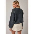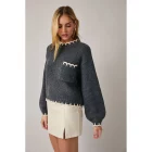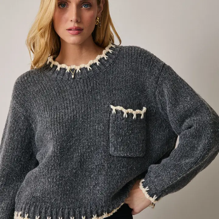 Cozy meets character in our Brooklyn textured charcoal knit sweater, designed with a relaxed silhouette and unique hand-finished details. Crafted from a soft, heavyweight yarn, it delivers warmth without sacrificing breathability. Contrast ivory whip-stitching frames the neckline, hem, cuffs, and pocket, giving the piece a distinct artisanal feel. A slouchy chest pocket adds dimension while maintaining an effortlessly casual look.