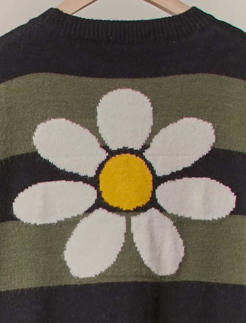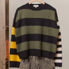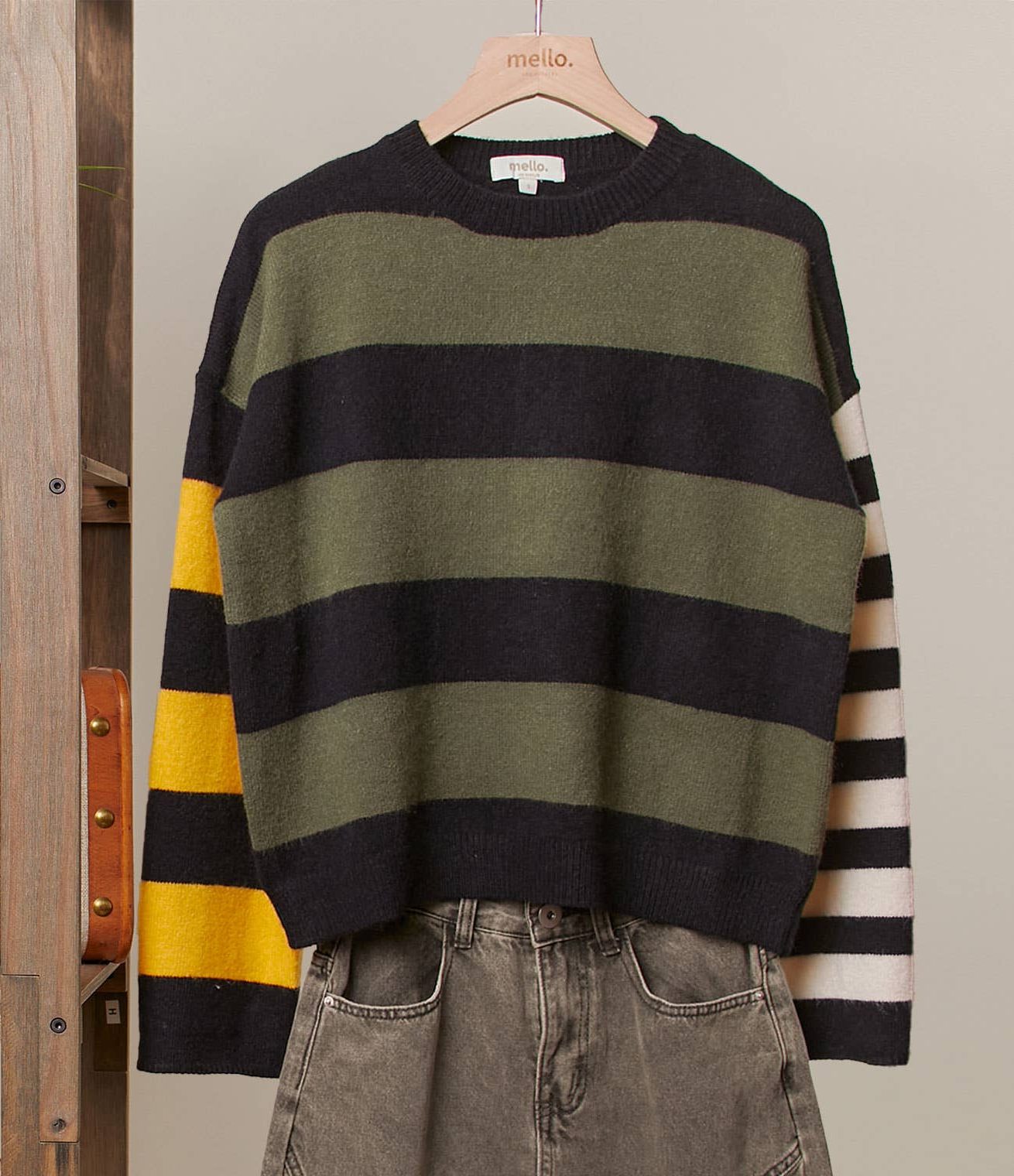 Add a bold touch to your everyday style with The Teagan. This cozy knit sweater features wide black and olive-green stripes with a pop of mustard yellow on one sleeve for a playful, modern twist. Its relaxed fit and soft knit fabric make it perfect for layering on chilly days while keeping your look effortlessly cool.