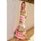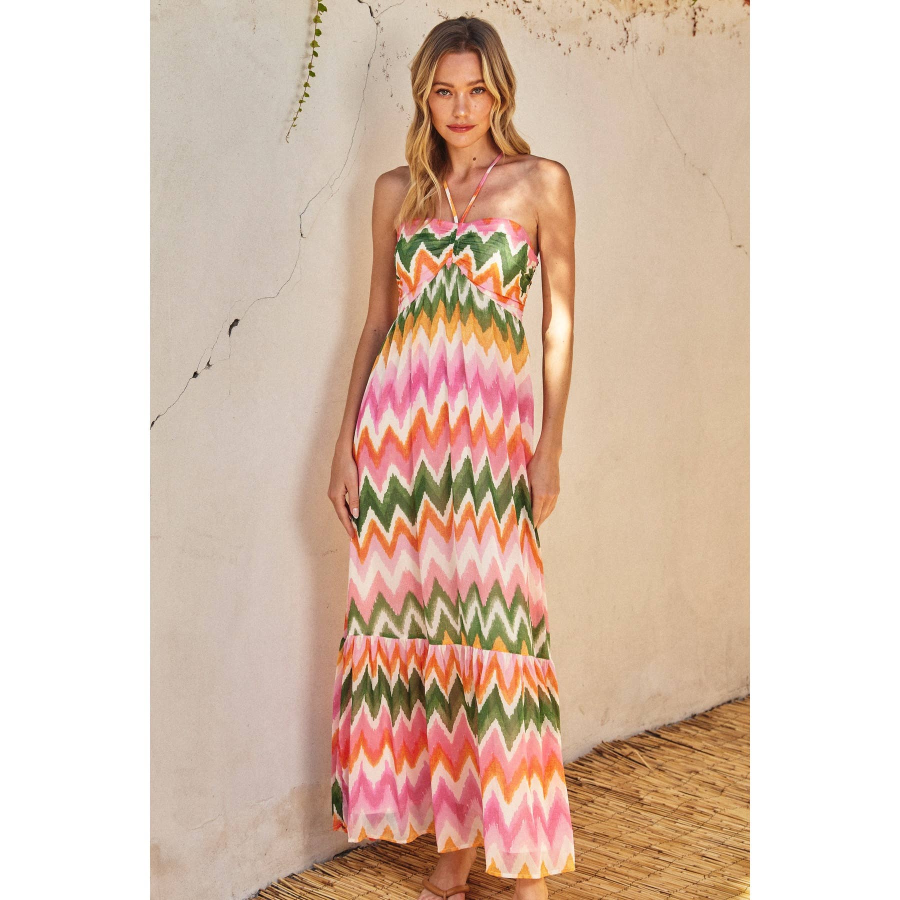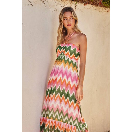 Bring the vibrant energy of summer wherever you go in our Cynthia Melon Dress. Featuring a playful chevron print in sunset-inspired hues of pink, orange, green, and white, this halter-neck beauty is your go-to for effortless chic. The strap-tie neckline and tiered hem create a flattering silhouette that flows gracefully with every step. Crafted from lightweight, breathable fabric, this dress is perfect for beach getaways, brunch dates, or golden hour strolls.