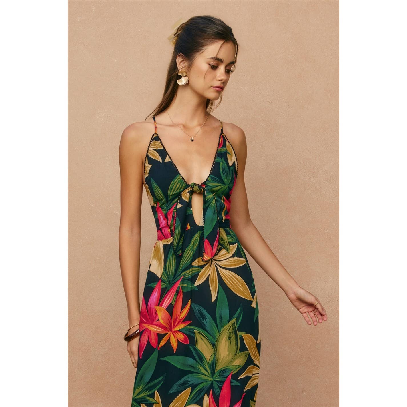 A subtle tie-front detail adds a touch of allure, while the fitted bodice flows into a sleek, elongated skirt for a streamlined finish. The vibrant floral print pops against a rich, dark backdrop, making it the perfect statement piece for warm-weather occasions.