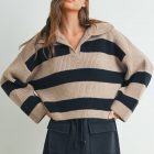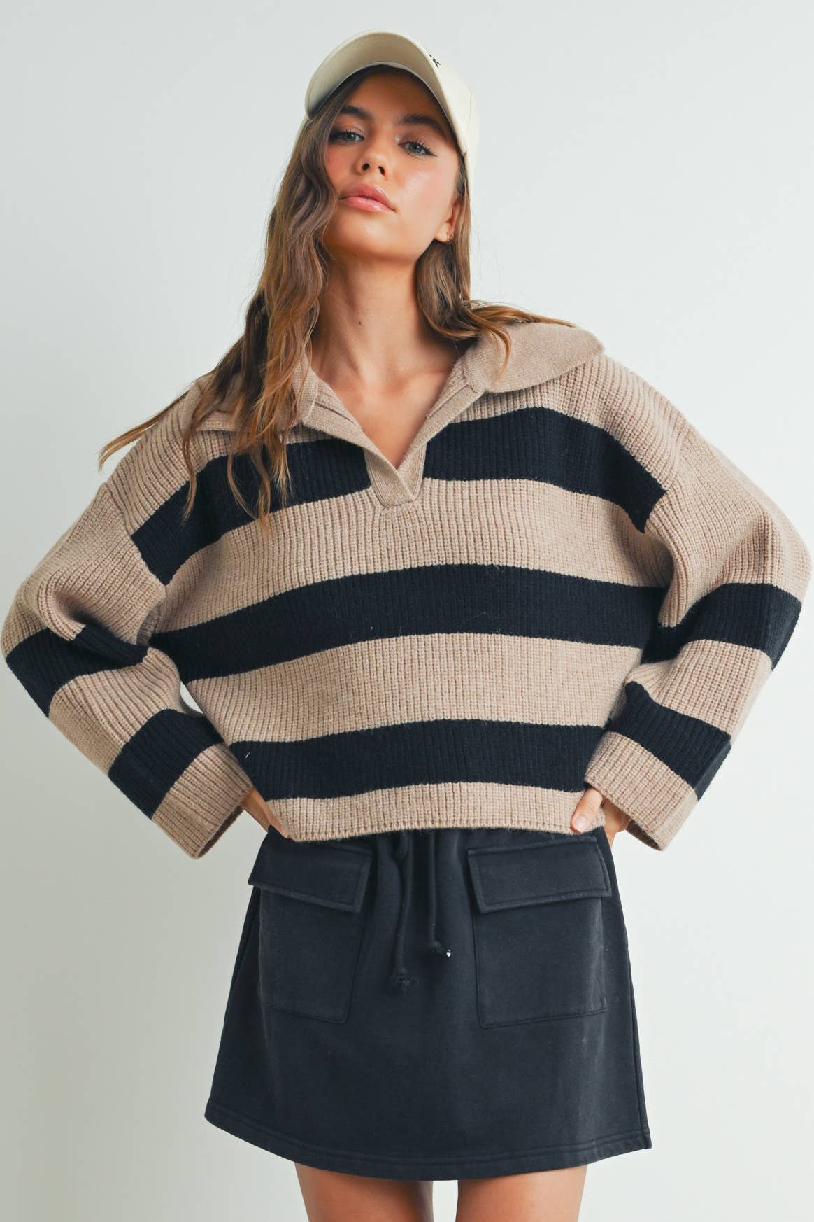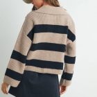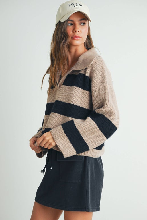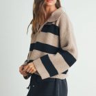 Our Gabby Rugby is a perfect blend of comfort and style! This trendy sweater features eye-catching stripes and a chic wide collar, making a bold statement effortlessly. Designed with a relaxed drop shoulder for laid-back elegance, this sweater keeps you cozy and fashionable all day long. Crafted from high-quality materials, it offers a soft and luxurious feel, perfect for any occasion. Versatile and on-trend, our Gabby sweater is the ideal choice for the office, outings with friends, or simply relaxing at home.