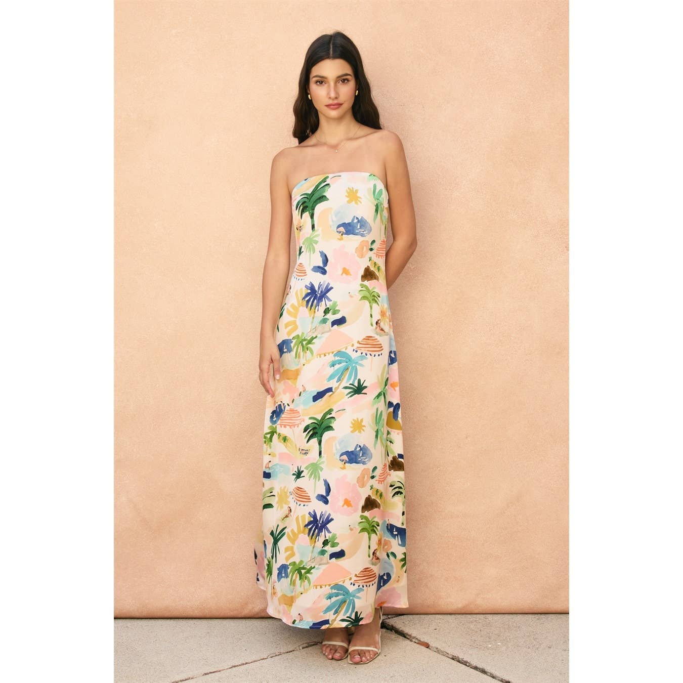 Conversational watercolored print strapless maxi dress. Model is 5'9" and wearing size Small.