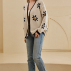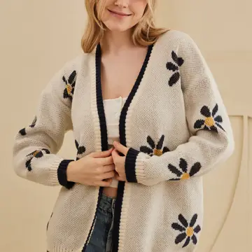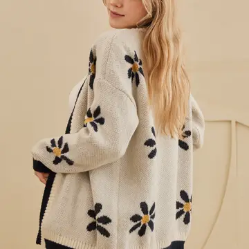 Wrap yourself in cozy charm with our Daisy Knit Cardigan — a soft, open-front sweater that blends comfort and playful style. Featuring delicate daisy flower patterns on the sleeves and front, this cardigan adds a cheerful touch to your everyday wardrobe. The contrasting navy trim along the neckline, cuffs, and hem gives it a refined finish, perfect for layering over your favorite tops.