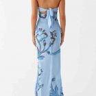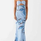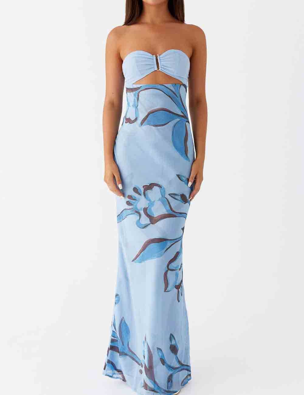 Turn heads in our Angel Maxi Dress — a dreamy statement piece made for summer soirées, beach weddings, and vacation nights. This elegant, form-fitting dress features a sweetheart-style strapless neckline with a flattering ruched bust and a sparkling center hardware detail. A subtle front cut-out adds just the right touch of allure, while the soft blue fabric is adorned with an abstract floral print in deep blues and rich chocolate tones. The lightweight material flows effortlessly with your every step, making it both striking and comfortable.