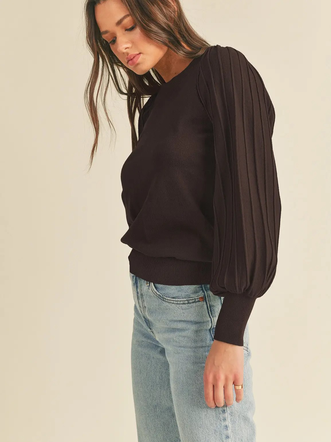 A chic upgrade to your wardrobe basics, this puff-sleeve sweater features textured ribbed sleeves and a smooth, comfortable knit body. Feminine, soft, and effortlessly stylish.
