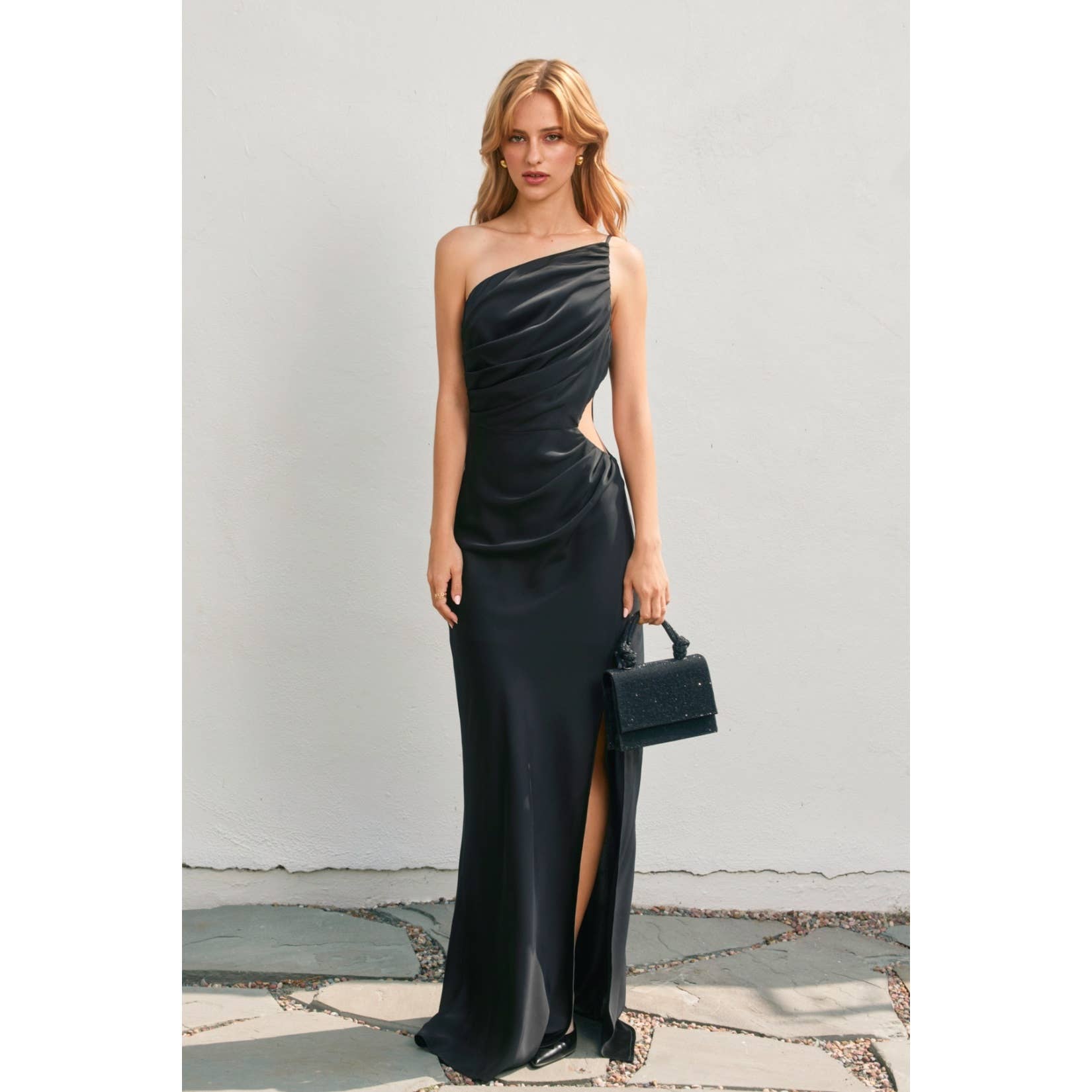 Exude timeless glamour in this sophisticated one-shoulder evening gown. Designed with an elegant asymmetrical neckline, this dress features soft draping across the bodice that enhances your natural shape while adding a refined, sculptural touch.
