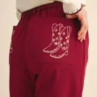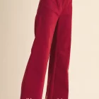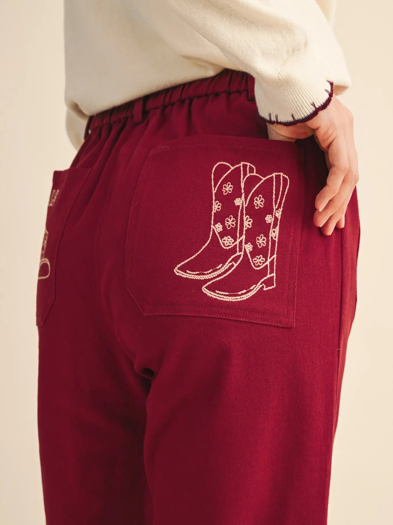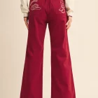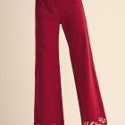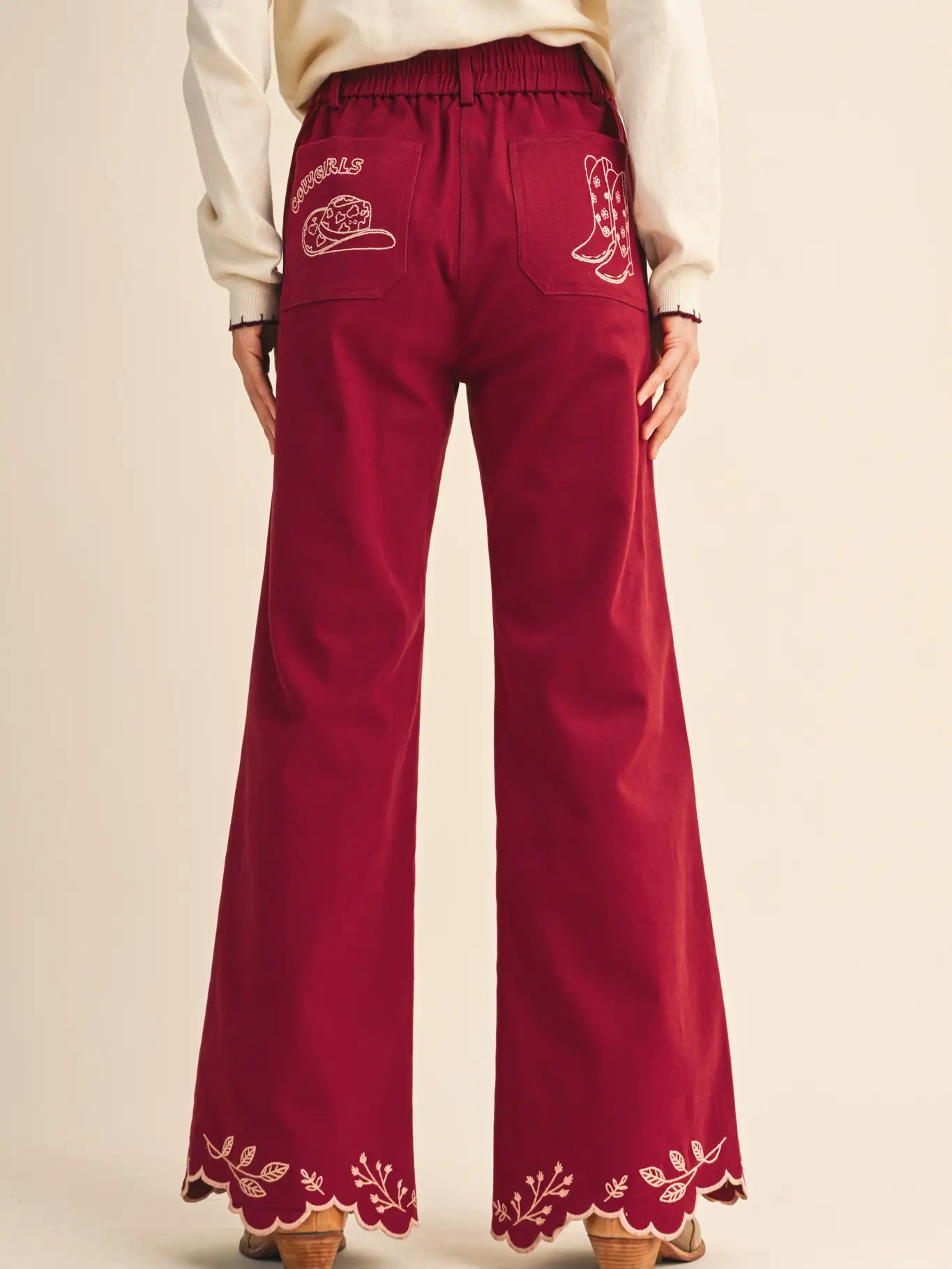 Make a statement with these high-rise flared pants, designed with a bold silhouette and charming Western-inspired embroidery. Crafted in a rich, vibrant red, they feature a flattering high waist, front patch pockets, and beautifully detailed scalloped hems embroidered with delicate floral motifs. The structured yet comfortable fabric gives them a polished look with all-day wearability.