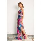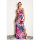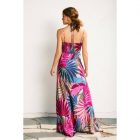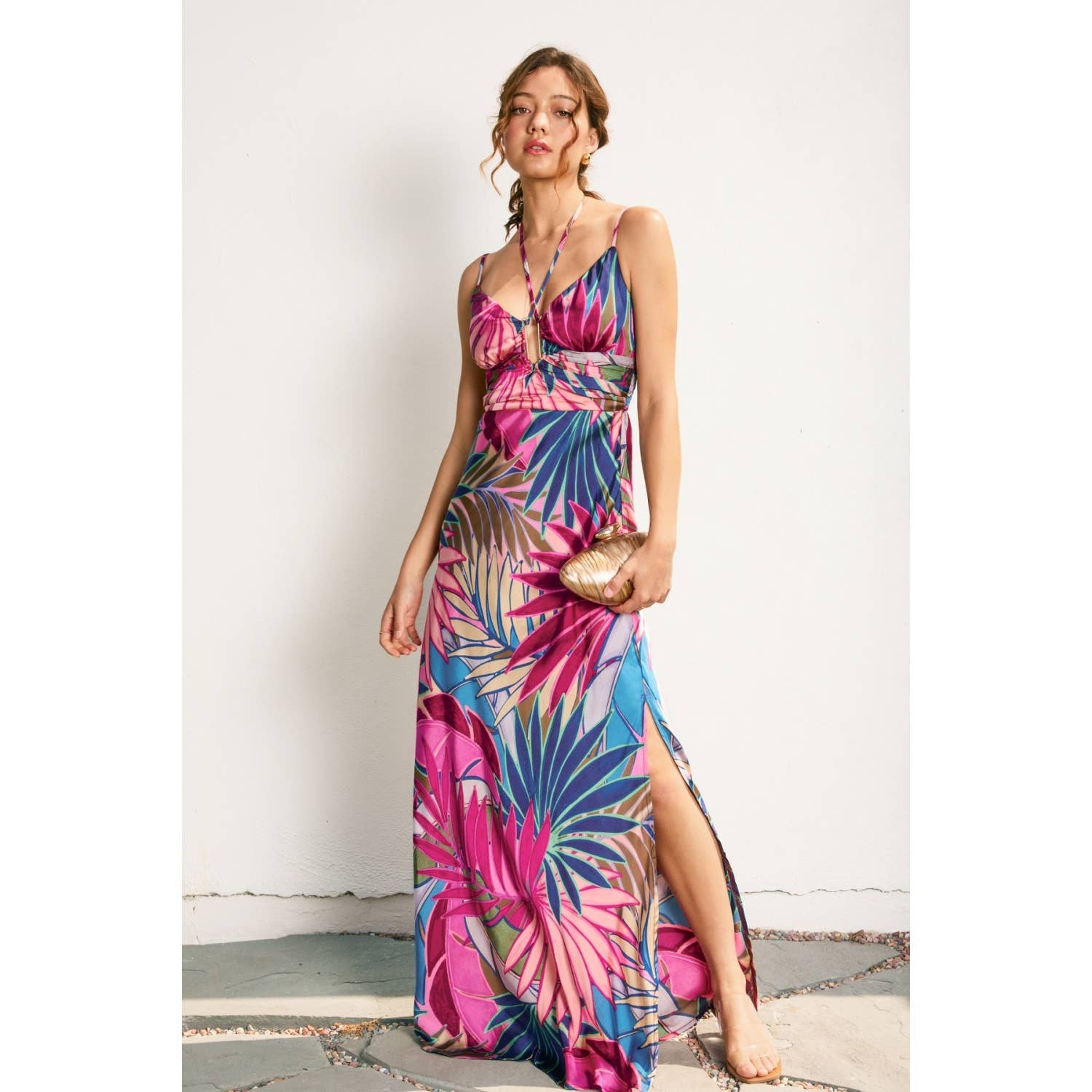 Make a statement in the Rita Midi Dress — a sultry, vacation-ready piece made for warm nights and sun-soaked escapes. Featuring a bold oversized palm print in electric pinks, deep blues, and earthy browns, this dress is designed to turn heads. The plunging neckline, adjustable spaghetti straps, and high side slit create a flattering, feminine silhouette, while Rita is ready to go! Perfect for a tropical getaway, Rita is soft & flowy. She will keep you cool and confident from beach bar to dinner date.