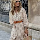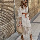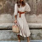 Capture effortless elegance with our Liv Mid Sleeve Midi Dress, a timeless staple for sunny days and city strolls. This flowy, lightweight dress features a soft geometric print in neutral tones, three-quarter balloon sleeves, and a flattering v-neckline. The rich tan belt cinches the waist perfectly, adding shape and a touch of earthy sophistication.