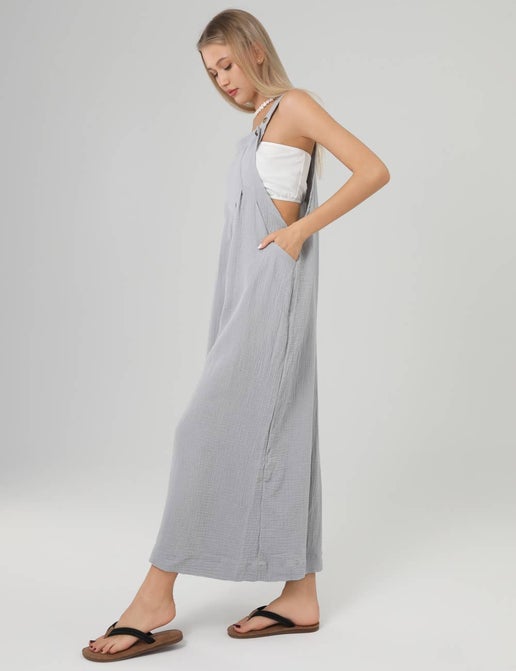 Say hello to your new go-to for effortless style and all-day comfort. The Leona Solid Color Overall Loose Crepe Jumpsuit features a relaxed, flowy silhouette with wide legs, adjustable button straps, and deep side pockets for laid-back practicality. Made from soft, breathable crinkle-textured fabric, this jumpsuit is perfect for layering over a bandeau or fitted tee. Whether you're lounging, traveling, or exploring the town, this easy, breezy piece moves with you—and looks amazing while doing it.
