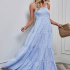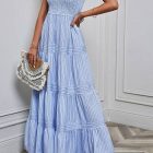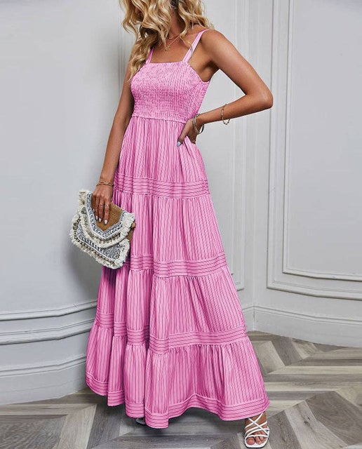 The Sophia Striped Spaghetti dress features an elegant striped design and a comfortable fit, making it suitable for various occasions. Its versatile style ensures easy pairing with different accessories and footwear for a polished look.