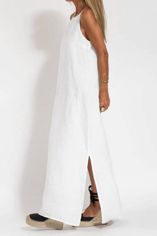 Elegance meets modern minimalism with The Waverly. Designed in a breezy, wide-leg silhouette, this sleeveless dress is crafted from lightweight fabric that drapes beautifully with every step. Featuring a simple round neckline and a relaxed fit, it’s the perfect one-and-done outfit for summer days, vacation evenings, or casual chic gatherings.