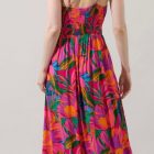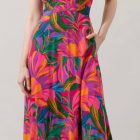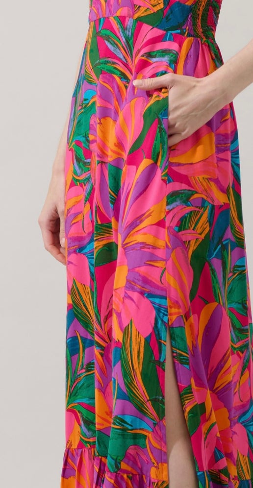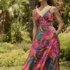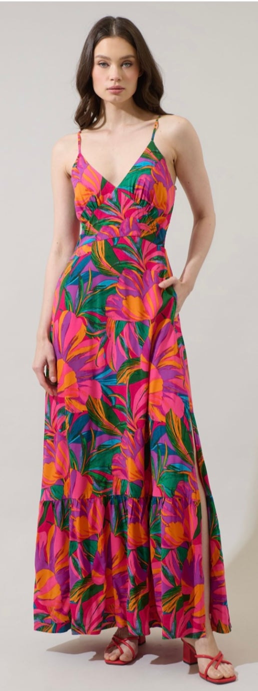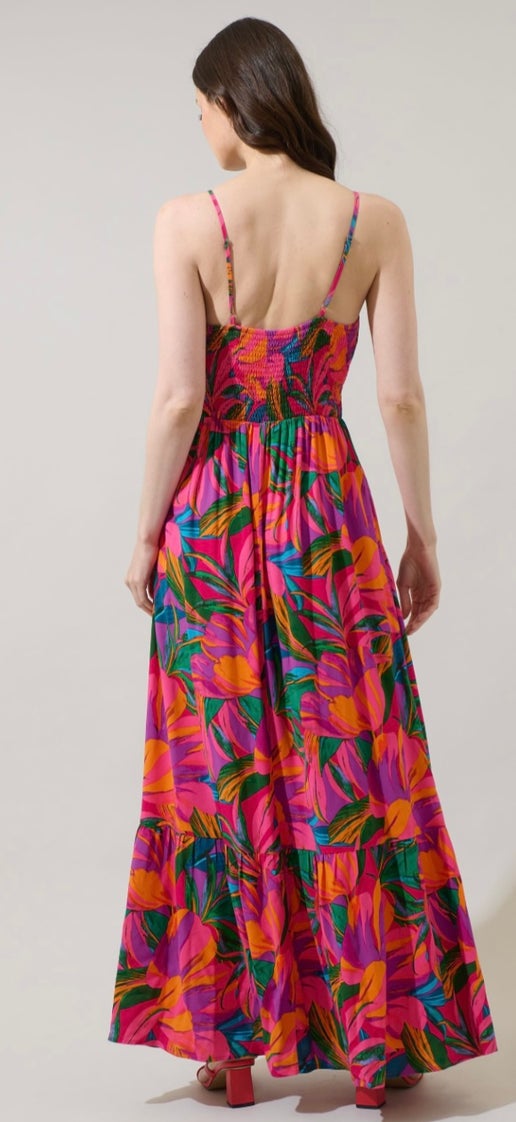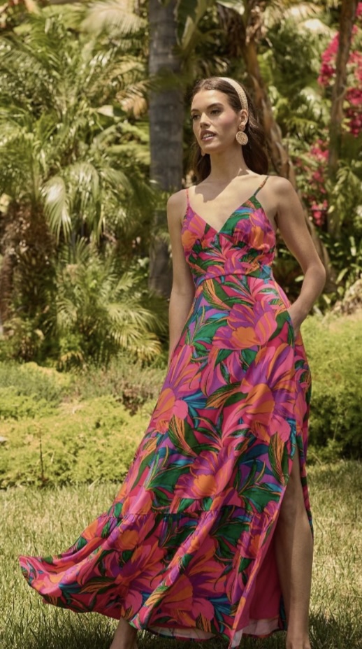 The Yelena, a flowy maxi dress designed for sun-drenched escapes and festive evenings. Featuring a bold tropical-inspired print in rich pink and deep blue and green hues, this dress is both striking and effortless. The plunging neckline, adjustable straps, and breezy hemline create a flattering silhouette that moves beautifully with you.